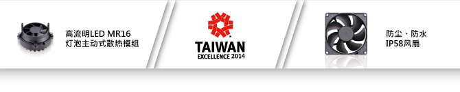 | 建准30余年来专注于微小型马达风扇的创新发明,自1996年起超过40余项产品,连续18年获得台湾精品奖、台湾精品金、银质奖等殊荣,今年又以「高流明LED MR16 灯泡主动式散热模块」与「防尘、防水IP58风扇」 2项创新产品荣获第22届台湾精品奖,获奖产品也将代表台湾在2014年营销全世界,再一次肯定建准在微小精密马达风扇的创新实力。 |